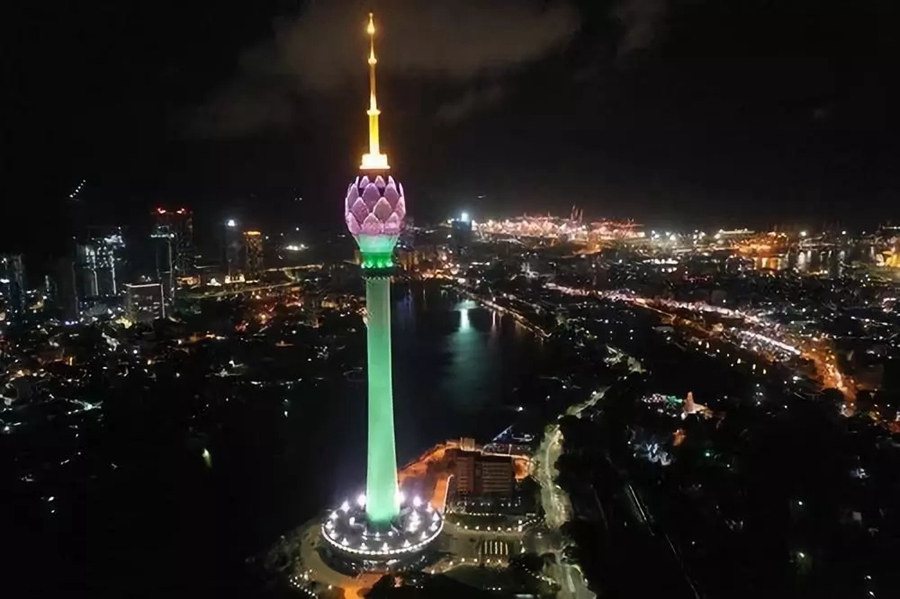 斯里蘭卡首都科倫坡地標(biāo)建筑蓮花電視塔9月16日晚舉行竣工慶典??苽惼律徎娨曀侵兴箖蓢凇耙粠б宦贰苯ㄔO(shè)中的重要合作項(xiàng)目。新華社發(fā)