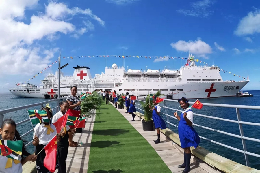 2018年10月12日,在多米尼克首都羅索,當(dāng)?shù)貙W(xué)生揮動(dòng)多中兩國國旗歡迎中國海軍和平方舟醫(yī)院船首次到訪。新華社發(fā)