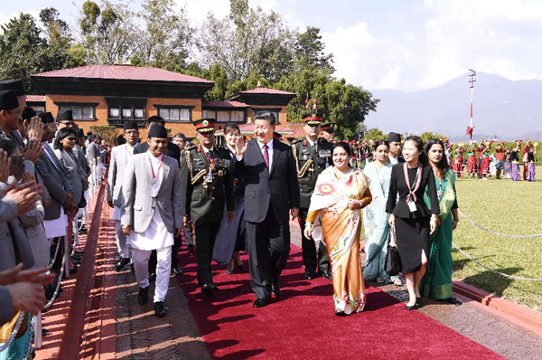 10月12日,國家主席習(xí)近平乘專機抵達加德滿都,開始對尼泊爾進行國事訪問。尼泊爾總統(tǒng)班達里在機場為習(xí)近平舉行具有濃郁尼泊爾民族特色的歡迎儀式。新華社記者高潔攝