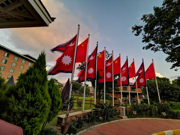 習(xí)近平主席在加德滿都下榻的飯店院內(nèi)飄揚著中尼兩國國旗。新華社記者賴向東攝