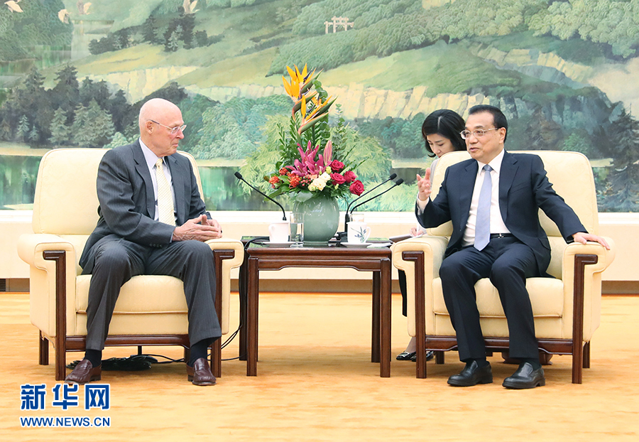 10月23日,國務(wù)院總理李克強(qiáng)在北京人民大會(huì)堂會(huì)見美國前財(cái)政部長保爾森。 新華社記者 姚大偉 攝