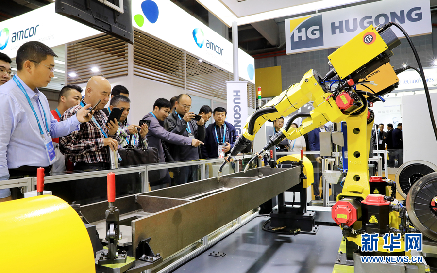 11月6日,在進(jìn)博會裝備展區(qū),一組正在進(jìn)行作業(yè)演示的焊接機(jī)器人吸引了參觀者的目光。當(dāng)日是第二屆中國國際進(jìn)口博覽會開幕第二天,上海國家會展中心迎來首個“大客流”。新華社記者 方喆 攝