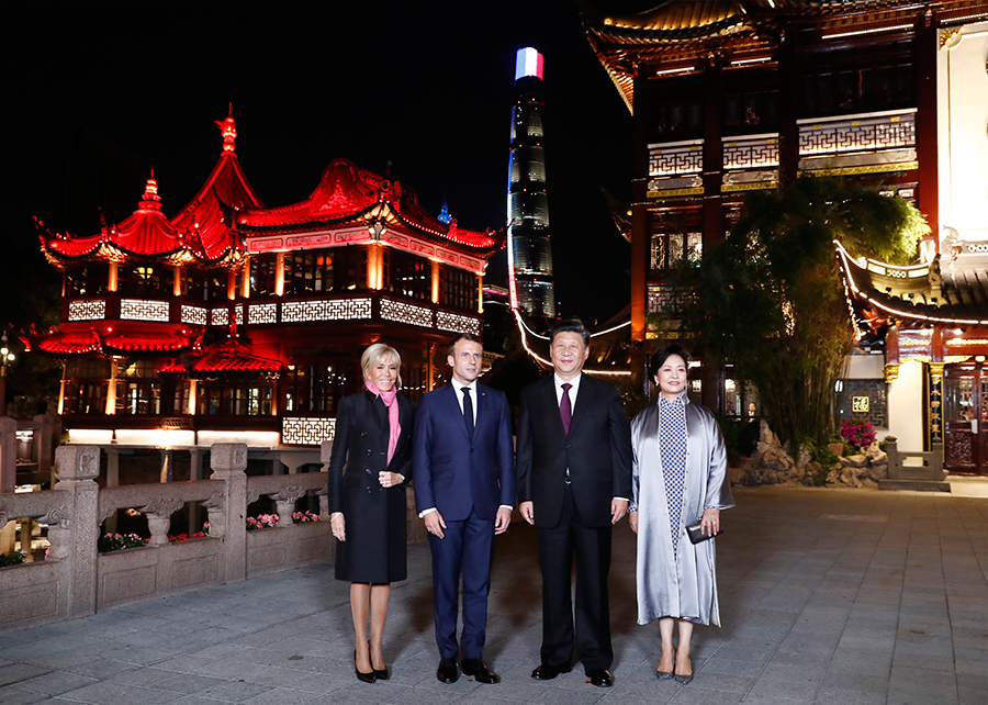 在前往北京前,5日晚,習(xí)近平主席和夫人彭麗媛在上??畲笋R克龍總統(tǒng)和夫人布麗吉特。地點(diǎn)是著名的江南古典園林——豫園。
