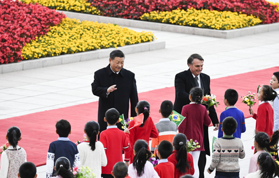 圖為2019年10月25日,習(xí)近平在人民大會(huì)堂東門(mén)外廣場(chǎng)為到訪的巴西總統(tǒng)博索納羅舉行歡迎儀式。在巴西出席金磚國(guó)家領(lǐng)導(dǎo)人會(huì)晤期間,習(xí)主席還將同博索納羅總統(tǒng)舉行會(huì)談。這將是一個(gè)月內(nèi)兩國(guó)元首再次互動(dòng)。新華社記者高潔攝