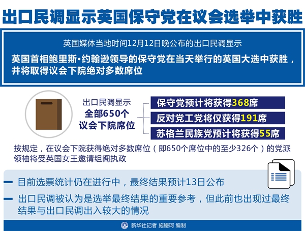 新華社倫敦12月12日電(記者桂濤 張代蕾)英國媒體12日晚公布的出口民調(diào)顯示,英國首相鮑里斯·約翰遜領(lǐng)導(dǎo)的保守黨在當(dāng)天舉行的英國大選中獲勝,并將取得議會下院絕對多數(shù)席位。
