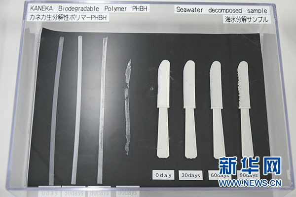 鐘化公司是日本一家知名化學(xué)品公司,記者日前前往鐘化公司的大阪總部,參觀了該公司研發(fā)的可降解聚合物“PHBH”。據(jù)介紹,這種可自然降解聚合物“PHBH”百分之百來源于植物,通過培養(yǎng)攝取植物油的微生物進行生產(chǎn)提取,可用于制造各種塑料制品,“PHBH”在自然界中可被多種微生物分解。鐘化公司還實物展示了“PHBH”塑料制品在海水中自然降解的不同階段,例如一根吸管在海水中90天幾乎可被自然降解殆盡。