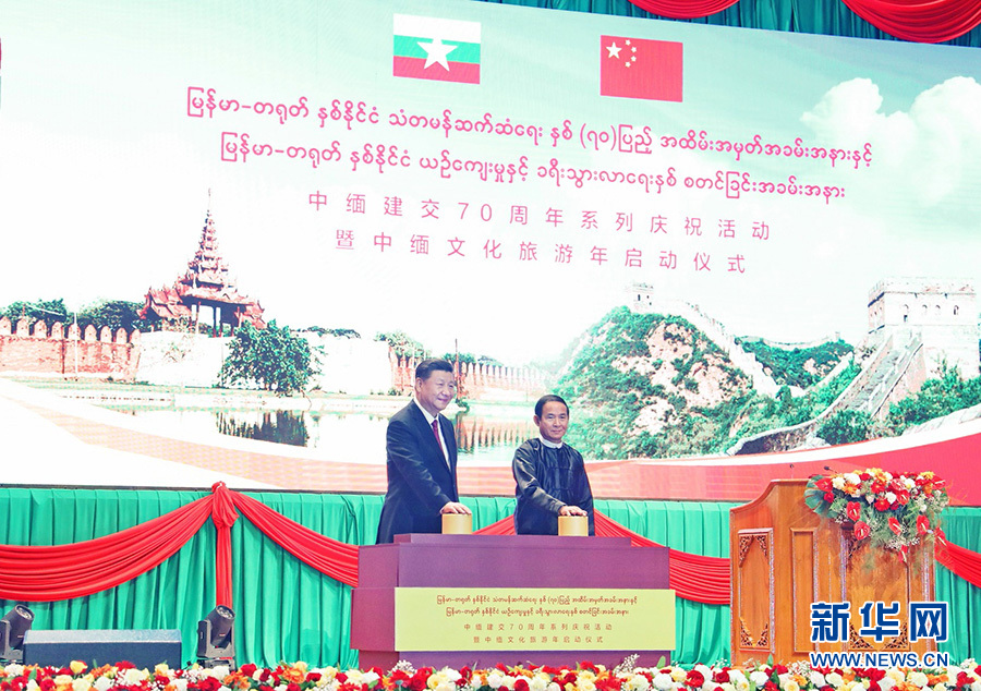 當(dāng)?shù)貢r間1月17日晚,國家主席習(xí)近平在內(nèi)比都第二國際會議中心出席中緬建交70周年慶?;顒郁咧芯捨幕糜文陠觾x式。這是習(xí)近平和緬甸總統(tǒng)溫敏共同按下按鈕,正式啟動中緬文化旅游年。 新華社記者 鞠鵬 攝