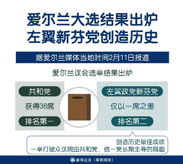 新華社都柏林2月11日電(記者張琪)據(jù)愛爾蘭媒體11日?qǐng)?bào)道,愛爾蘭議會(huì)選舉結(jié)果出爐:共和黨獲得38席,排名第一;左翼政黨新芬黨僅以一席之差排名第二,創(chuàng)造歷史最佳成績(jī),一舉打破眾議院由共和黨、統(tǒng)一黨長(zhǎng)期主導(dǎo)的局面。