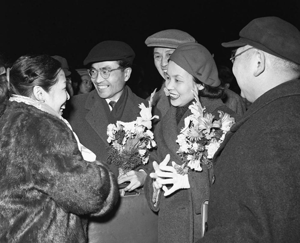 團(tuán)長清水正夫(前左二)和夫人松山樹子(前左三)率領(lǐng)的日本松山芭蕾舞蹈團(tuán)于1958年3月8日到達(dá)北京,受到首都戲劇舞蹈界人士的熱烈歡迎。新華社記者吳化學(xué)攝