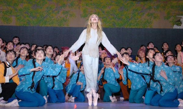 2004年12月28日,為慶祝日本松山芭蕾舞團(tuán)理事長清水正夫獲得中國“文化交流貢獻(xiàn)獎”,日本松山芭蕾舞團(tuán)在東京上演現(xiàn)代芭蕾舞劇《白毛女》,第二代白毛女扮演者森下洋子(中)在舞劇《白毛女》中飾演“喜兒”。 新華社記者馬平攝