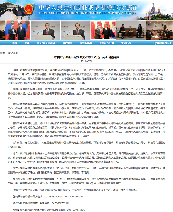 近期,隨著新冠肺炎疫情的發(fā)展,俄羅斯面臨的防疫壓力加大。此前,俄方向我館提出,希使館協(xié)助勸說尚在國內(nèi)的中國留俄學(xué)生推遲至3月2日后返校。2月14日,我館發(fā)布通報,希留俄學(xué)生遵照俄方有關(guān)要求暫緩返校。但是,仍有數(shù)千名留學(xué)生堅持返校,俄方感到防疫形勢十分嚴(yán)峻。根據(jù)俄防疫規(guī)定,留學(xué)人員屬長期在俄居留人員,自中國抵俄后需自覺在居住地隔離14天,此項規(guī)定針對所有國家人員。自國內(nèi)返俄的使領(lǐng)館工作人員均自覺執(zhí)行俄方隔離14天規(guī)定,隔離期結(jié)束確認(rèn)身體健康后才上班。