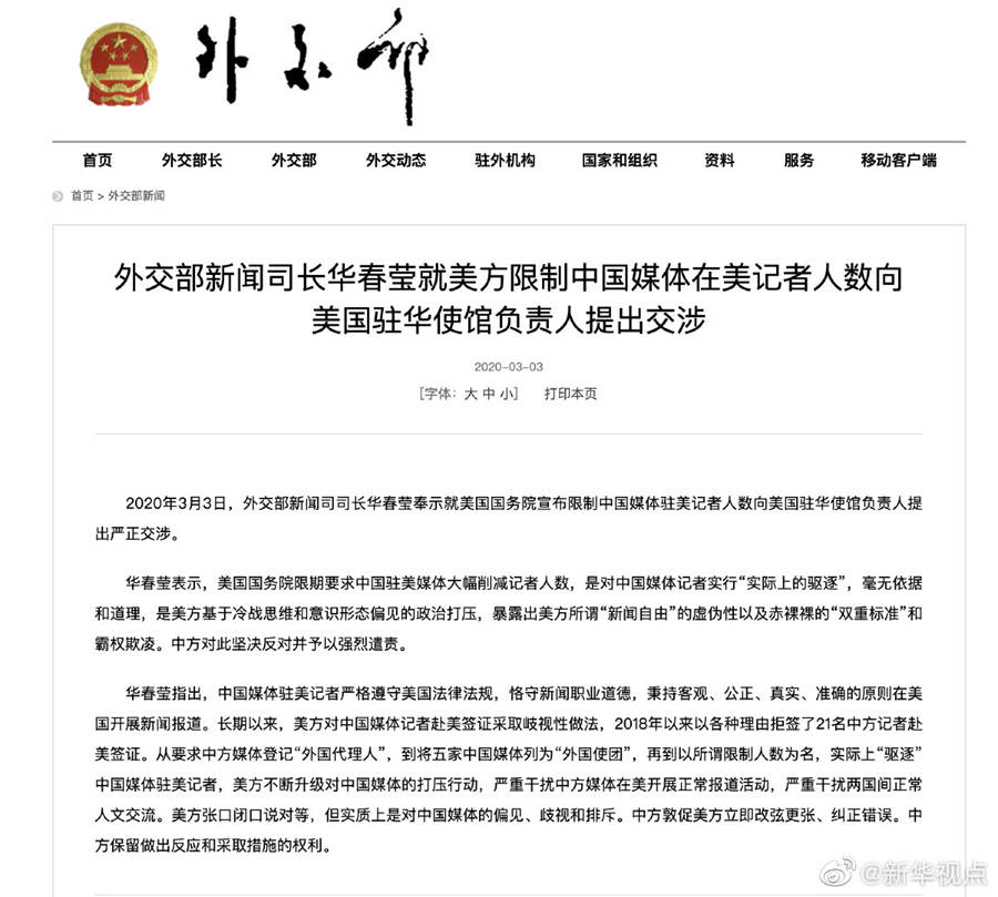 外交部新聞司司長華春瑩3日奉示就美國國務院宣布限制中國媒體駐美記者人數(shù)向美國駐華使館負責人提出嚴正交涉。華春瑩表示,美國國務院限期要求中國駐美媒體大幅削減記者人數(shù),是對中國媒體記者實行“實際上的驅(qū)逐”,毫無依據(jù)和道理,是美方基于冷戰(zhàn)思維和意識形態(tài)偏見的政治打壓,暴露出美方所謂“新聞自由”的虛偽性以及赤裸裸的“雙重標準”和霸權(quán)欺凌。中方對此堅決反對并予以強烈遣責。中方敦促美方立即改弦更張、糾正錯誤。中方保留做出反應和采取措施的權(quán)利。(記者朱超)