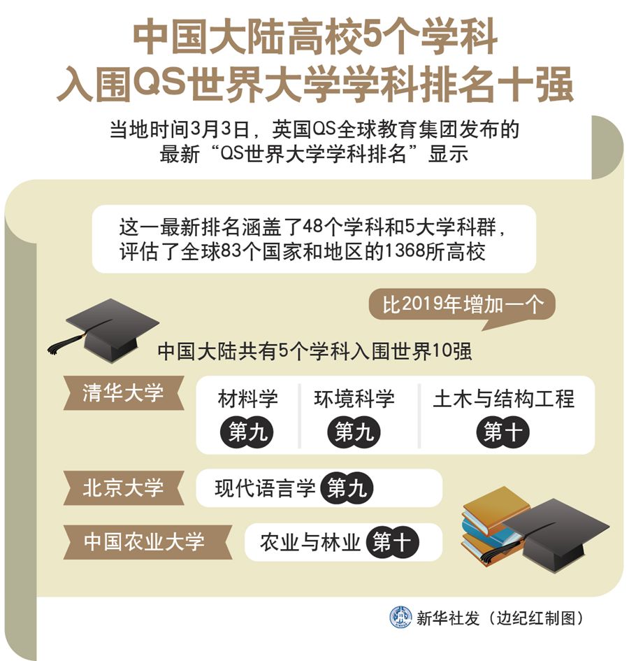 圖表:中國大陸高校5個(gè)學(xué)科入圍QS世界大學(xué)學(xué)科排名十強(qiáng) 新華社發(fā) 邊紀(jì)紅 制圖
