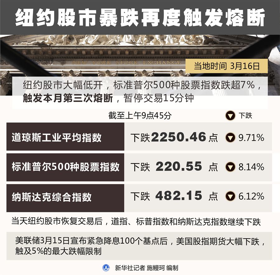 由于新冠肺炎疫情在美國持續(xù)擴(kuò)散引發(fā)市場廣泛擔(dān)憂,紐約股市16日開盤暴跌,并再次觸發(fā)7%的熔斷點(diǎn)。交易重啟后跌幅擴(kuò)大,收盤時(shí)紐約股市三大股指均暴跌超過11%。
