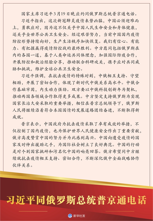 習(xí)近平指出,這次新冠肺炎疫情來勢兇猛,中國必須迎難而上,勇敢應(yīng)對,因為這不僅關(guān)乎中國人民生命安全和身體健康,還關(guān)乎全世界公共衛(wèi)生安全。經(jīng)過艱苦努力,當(dāng)前中國國內(nèi)疫情防控形勢持續(xù)向好,生產(chǎn)生活秩序加快恢復(fù)。我們有信心、有能力、有把握贏得疫情防控戰(zhàn)的最終勝利。中方愿同包括俄羅斯在內(nèi)的各國一道,基于人類命運共同體理念,加強(qiáng)國際防疫合作,開展防控和救治經(jīng)驗分享,推動聯(lián)合科研攻關(guān),攜手應(yīng)對共同威脅和挑戰(zhàn),維護(hù)全球公共衛(wèi)生安全。