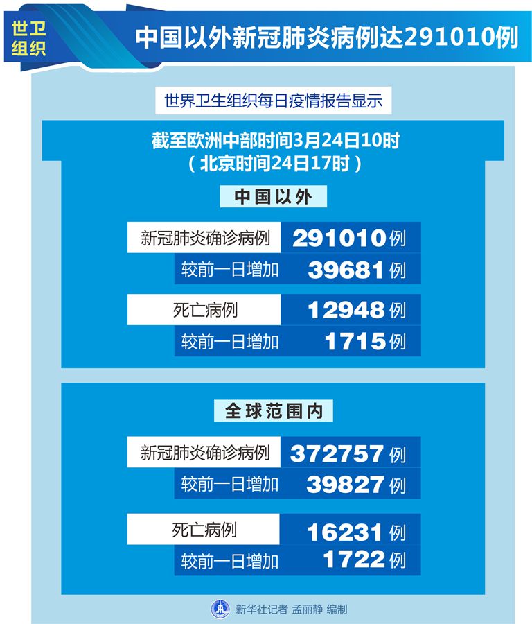 新華社日內(nèi)瓦3月24日電(記者劉曲)世界衛(wèi)生組織24日公布的最新數(shù)據(jù)顯示,中國(guó)以外新冠肺炎確診病例達(dá)到291010例。