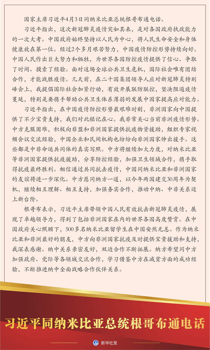 習(xí)近平指出,在中國疫情防控形勢(shì)最艱難時(shí)刻,非洲國家向中國提供了不少寶貴支持,我們對(duì)此銘記在心。我非常關(guān)心當(dāng)前非洲疫情形勢(shì)。中方克服困難,積極向非盟和非洲國家提供抗疫物資援助,組織專家視頻會(huì)議交流經(jīng)驗(yàn),中國企業(yè)和民間機(jī)構(gòu)也紛紛向非洲國家伸出援手。這些都是中非命運(yùn)共同體的真實(shí)寫照。中方將繼續(xù)加大力度,對(duì)納米比亞等非洲國家提供抗疫援助,分享防控經(jīng)驗(yàn),加強(qiáng)衛(wèi)生領(lǐng)域合作,攜手取得抗疫最終勝利。相信通過共同抗擊疫情,中國同納米比亞和非洲國家的友誼將進(jìn)一步深化。中方愿同納方一道,以今年兩國建交30周年為契機(jī),繼續(xù)相互理解、相互支持,加強(qiáng)務(wù)實(shí)合作,推動(dòng)中納、中非關(guān)系邁上新臺(tái)階。