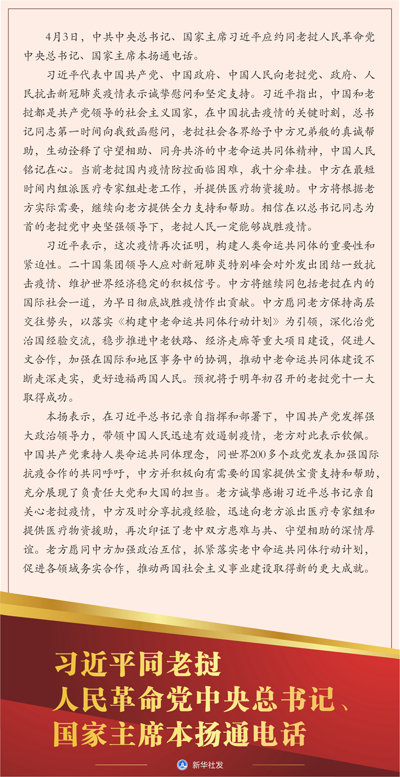 習(xí)近平代表中國共產(chǎn)黨、中國政府、中國人民向老撾黨、政府、人民抗擊新冠肺炎疫情表示誠摯慰問和堅(jiān)定支持。習(xí)近平指出,中國和老撾都是共產(chǎn)黨領(lǐng)導(dǎo)的社會(huì)主義國家,在中國抗擊疫情的關(guān)鍵時(shí)刻,總書記同志第一時(shí)間向我致函慰問,老撾社會(huì)各界給予中方兄弟般的真誠幫助,生動(dòng)詮釋了守望相助、同舟共濟(jì)的中老命運(yùn)共同體精神,中國人民銘記在心。當(dāng)前老撾國內(nèi)疫情防控面臨困難,我十分牽掛。中方在最短時(shí)間內(nèi)組派醫(yī)療專家組赴老工作,并提供醫(yī)療物資援助。中方將根據(jù)老方實(shí)際需要,繼續(xù)向老方提供全力支持和幫助。相信在以總書記同志為首的老撾黨中央堅(jiān)強(qiáng)領(lǐng)導(dǎo)下,老撾人民一定能夠戰(zhàn)勝疫情。