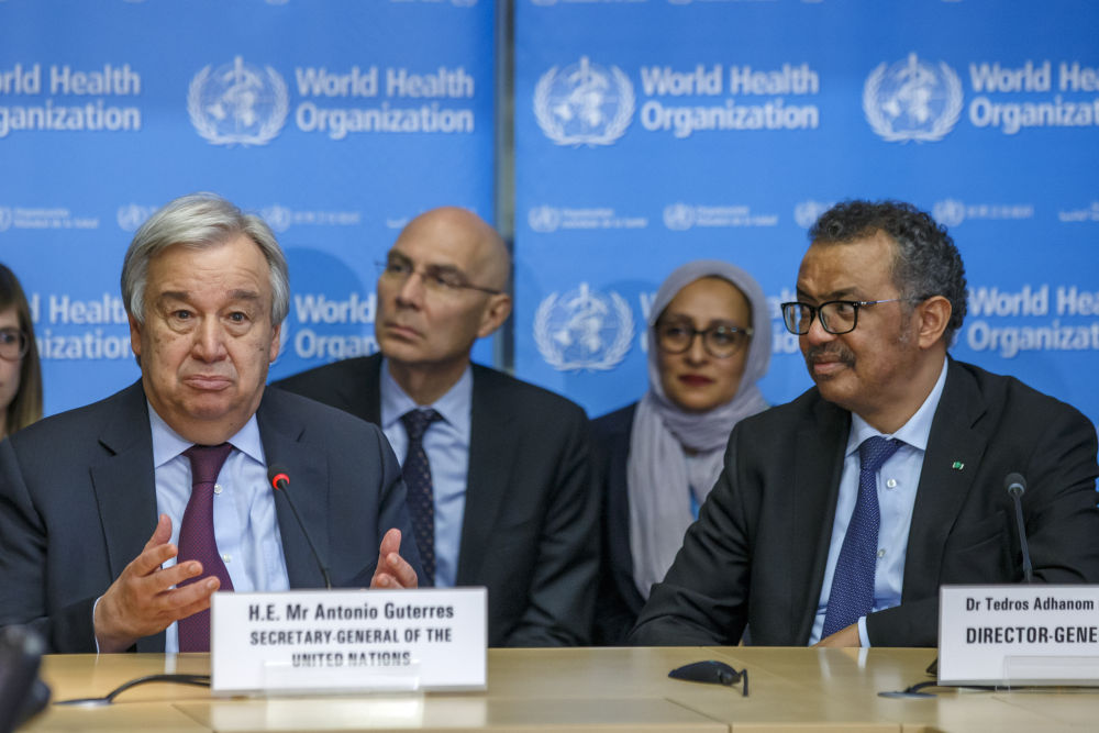 2月24日,在瑞士日內(nèi)瓦,聯(lián)合國秘書長古特雷斯(左)在世界衛(wèi)生組織總部發(fā)表講話。新華社發(fā)