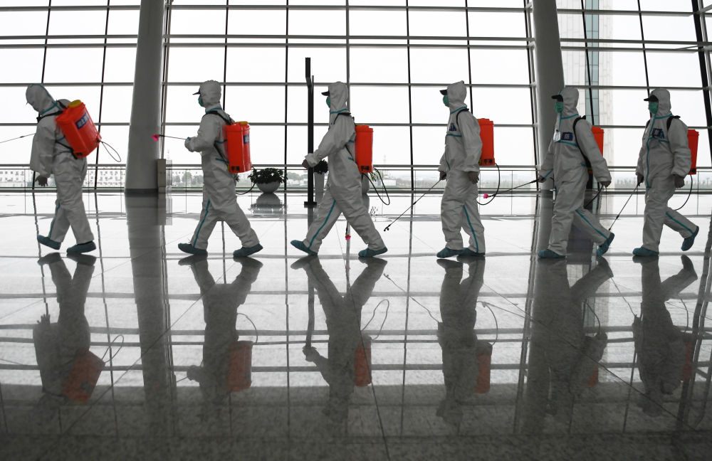 4月3日,在武漢天河機(jī)場(chǎng),消防隊(duì)員進(jìn)入航站樓進(jìn)行消殺作業(yè)。新華社記者 程敏 攝