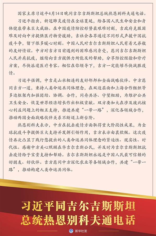 習(xí)近平指出,新冠肺炎疫情在全球蔓延,給各國人民生命安全和身體健康帶來巨大威脅。在中國疫情防控形勢最艱難時刻,吉政府克服困難及時向中方提供醫(yī)療物資援助,吉社會各界通過不同形式聲援中國抗疫斗爭,留下很多暖心時刻。中國人民對吉爾吉斯斯坦人民有著兄弟般的友好情誼。中方對吉方目前遇到的困難感同身受,愿同吉爾吉斯斯坦人民并肩抗疫,繼續(xù)向吉方提供力所能及的幫助,分享防控經(jīng)驗(yàn)和診療方案,盡快派遣醫(yī)療專家。相信在你領(lǐng)導(dǎo)下,吉方一定能夠盡快戰(zhàn)勝疫情。
