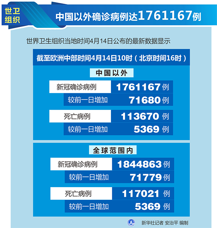 新華社日內(nèi)瓦4月14日電(記者劉曲)世界衛(wèi)生組織14日公布的最新數(shù)據(jù)顯示,中國以外新冠確診病例達(dá)到1761167例。