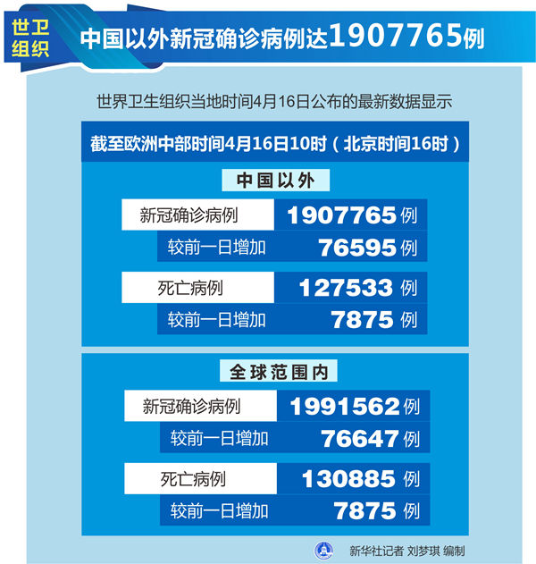 新華社日內(nèi)瓦4月16日電(記者劉曲)世界衛(wèi)生組織16日公布的最新數(shù)據(jù)顯示,中國以外新冠確診病例達1907765例。