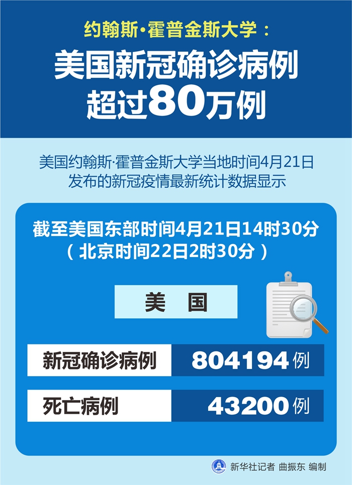 新華社紐約4月21日電? 美國(guó)約翰斯·霍普金斯大學(xué)21日發(fā)布的新冠疫情最新統(tǒng)計(jì)數(shù)據(jù)顯示,截至美國(guó)東部時(shí)間21日14時(shí)30分(北京時(shí)間22日2時(shí)30分),美國(guó)新冠確診病例升至804194例,死亡病例為43200例。