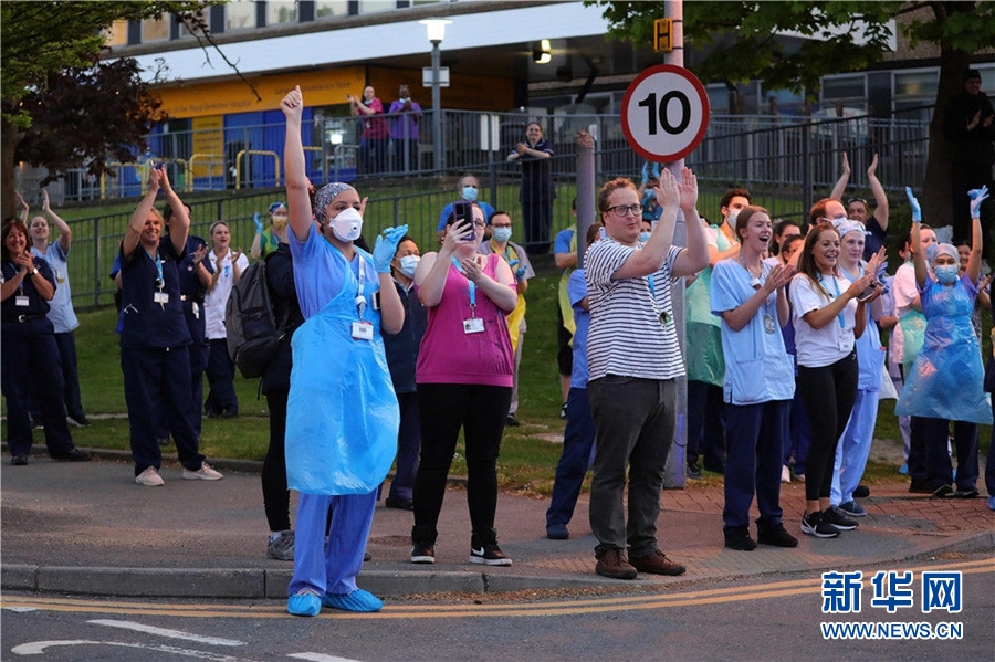 4月23日,在英國(guó)雷丁,皇家伯克郡醫(yī)院的醫(yī)護(hù)人員在醫(yī)院外鼓掌。新冠疫情暴發(fā)以來,每周四晚八時(shí),英國(guó)人在陽臺(tái)、門前或窗前鼓掌,向醫(yī)護(hù)人員致敬。部分醫(yī)院的醫(yī)護(hù)人員也忙里偷閑走出醫(yī)院,感謝人們的支持,也為自己鼓掌加油。新華社發(fā)(蒂姆·愛爾蘭攝)