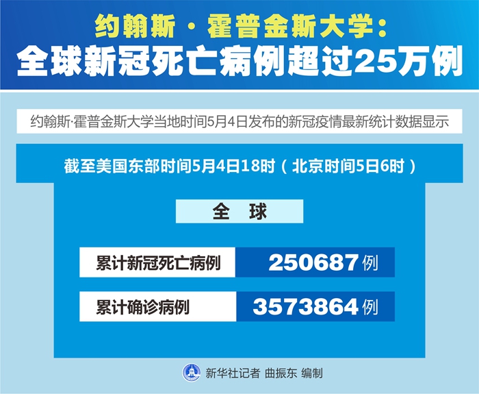 新華社紐約5月4日電? 美國(guó)約翰斯·霍普金斯大學(xué)4日發(fā)布的新冠疫情最新統(tǒng)計(jì)數(shù)據(jù)顯示,全球累計(jì)新冠死亡病例超過(guò)25萬(wàn)例。