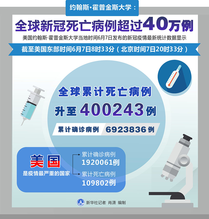 根據(jù)該校的疫情數(shù)據(jù)統(tǒng)計(jì)系統(tǒng),截至美國(guó)東部時(shí)間7日8時(shí)33分(北京時(shí)間7日20時(shí)33分),全球累計(jì)死亡病例升至400243例,累計(jì)確診病例升至6923836例。
