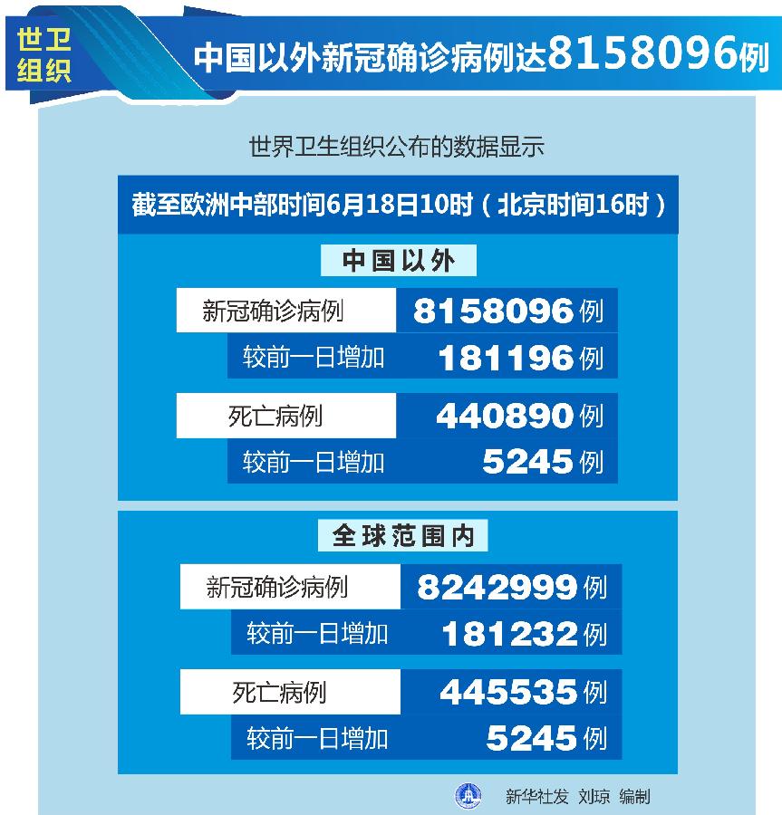 新華社日內(nèi)瓦6月18日電(記者劉曲)世界衛(wèi)生組織18日公布的最新數(shù)據(jù)顯示,中國(guó)以外新冠確診病例達(dá)到8158096例。
