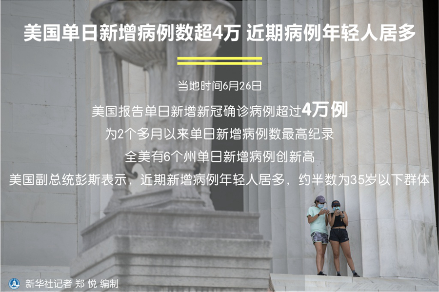 新華社華盛頓6月26日電(記者譚晶晶)美國(guó)26日?qǐng)?bào)告單日新增新冠確診病例超過4萬(wàn)例,為2個(gè)多月以來單日新增病例數(shù)最高紀(jì)錄。全美有6個(gè)州單日新增病例創(chuàng)新高。美國(guó)副總統(tǒng)彭斯表示,近期新增病例年輕人居多,約半數(shù)為35歲以下群體。