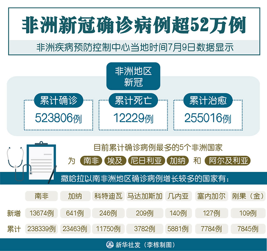 新華社雅溫得7月9日電 綜合新華社駐非洲地區(qū)記者報道:非洲疾病預(yù)防控制中心9日數(shù)據(jù)顯示,非洲地區(qū)新冠累計確診病例已達(dá)523806例,累計死亡12229例,累計治愈255016例。