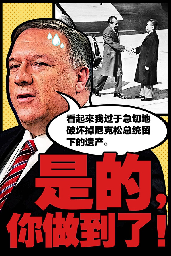 蓬佩奧選擇在“尼克松總統(tǒng)圖書館暨博物館”發(fā)表演說極具諷刺意味。中美近50年來的友好交往關(guān)系是兩國老一代領(lǐng)導(dǎo)人開創(chuàng)的,是對全世界的建設(shè)性貢獻(xiàn)。蓬佩奧作為中美關(guān)系的拆臺(tái)者,在此地演講不僅不配,而且是對尼克松總統(tǒng)的大不敬。