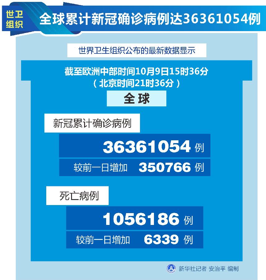世衛(wèi)組織網(wǎng)站最新數(shù)據(jù)顯示,截至歐洲中部時(shí)間9日15時(shí)36分(北京時(shí)間21時(shí)36分),全球確診病例較前一日增加350766例,達(dá)到36361054例;死亡病例增加6339例,達(dá)到1056186例。