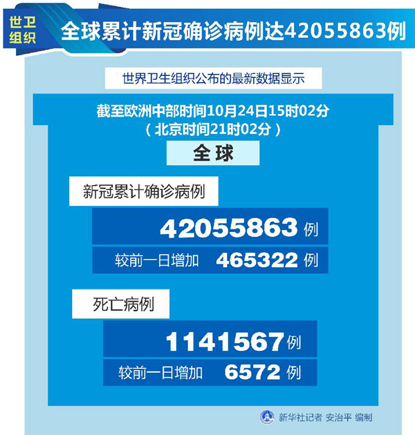 世衛(wèi)組織網(wǎng)站最新數(shù)據(jù)顯示,截至歐洲中部時間24日15時02分(北京時間21時02分),全球確診病例較前一日增加465322例,達(dá)到42055863例;死亡病例增加6572例,達(dá)到1141567例。