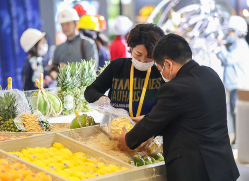 11月2日,在食品及農(nóng)產(chǎn)品展區(qū),一企業(yè)展臺(tái)的工作人員在擺放展品。連日來(lái),第三屆中國(guó)國(guó)際進(jìn)口博覽會(huì)舉辦地國(guó)家會(huì)展中心(上海)內(nèi)一派忙碌景象,各個(gè)展館的搭建和布置工作正有條不紊地進(jìn)行。新華社記者 丁汀 攝