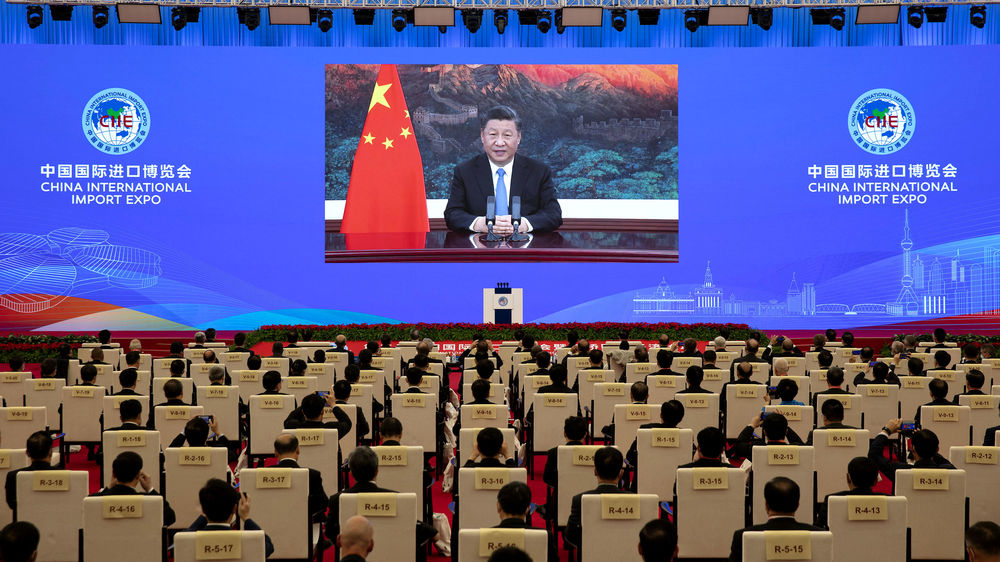 11月4日晚,習(xí)近平在第三屆中國(guó)國(guó)際進(jìn)口博覽會(huì)開(kāi)幕式上以視頻方式發(fā)表主旨演講。新華社記者 黃敬文 攝
