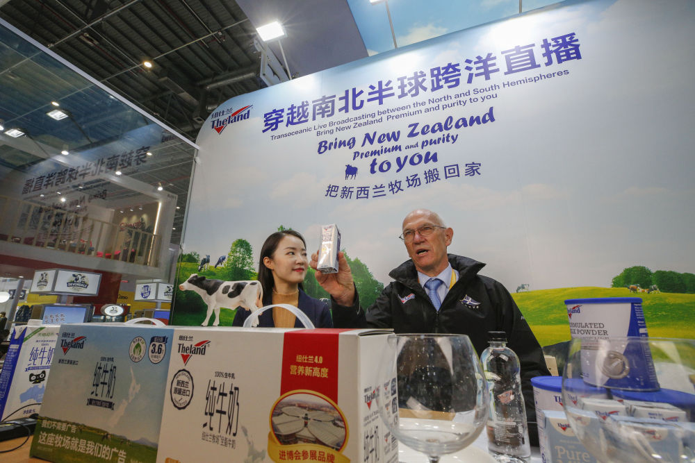 11月7日,羅伊(右)在第三屆進博會紐仕蘭乳業(yè)展臺直播帶貨。