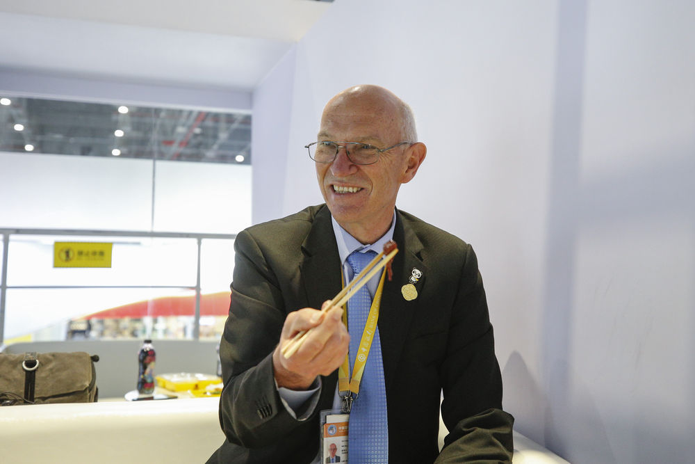 11月7日,午休時,羅伊在第三屆進博會紐仕蘭乳業(yè)展臺使用筷子吃飯。