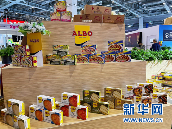 展臺(tái)陳列著多種口味的罐頭。 新華網(wǎng) 佘靈 攝