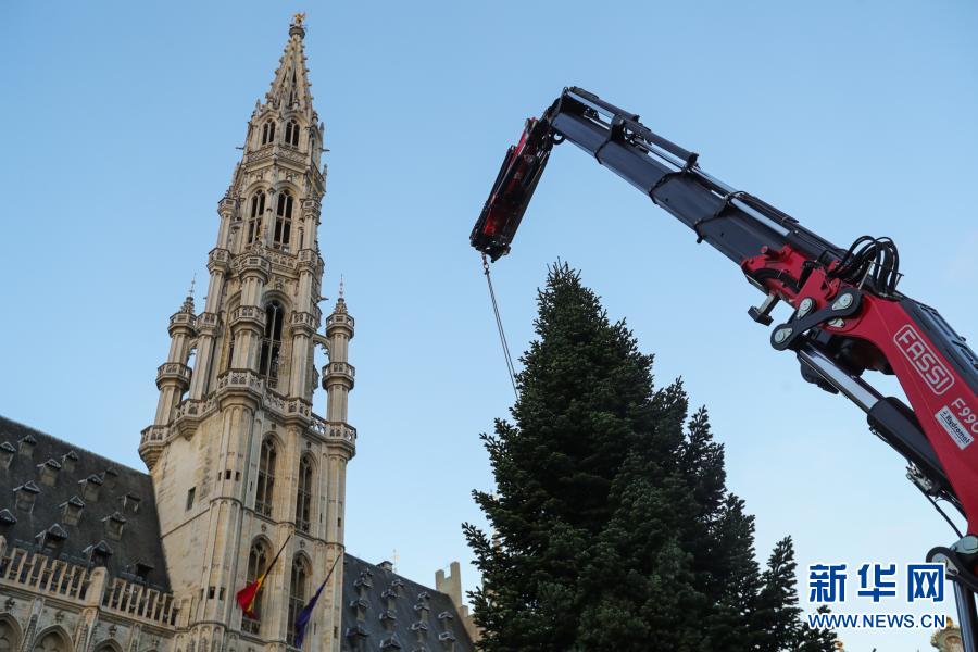 這是11月19日在比利時(shí)布魯塞爾大廣場(chǎng)拍攝的圣誕樹安裝現(xiàn)場(chǎng)。