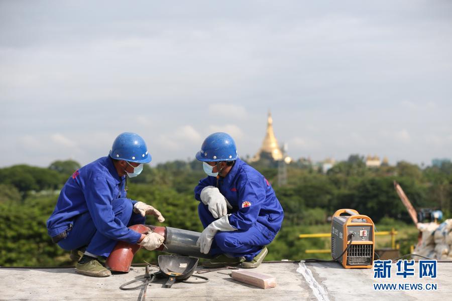 10月28日,在緬甸仰光的國家劇院維修改造項目現(xiàn)場,覺泰昂在師父的指導下焊接鋼管。新華社發(fā)(吳昂攝)