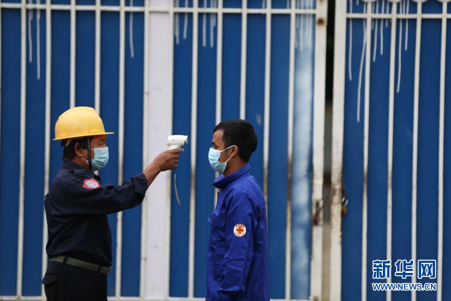 10月28日,在緬甸仰光的國家劇院維修改造項目現(xiàn)場,準備上班的覺泰昂(右)接受體溫測量。新華社發(fā)(吳昂攝)