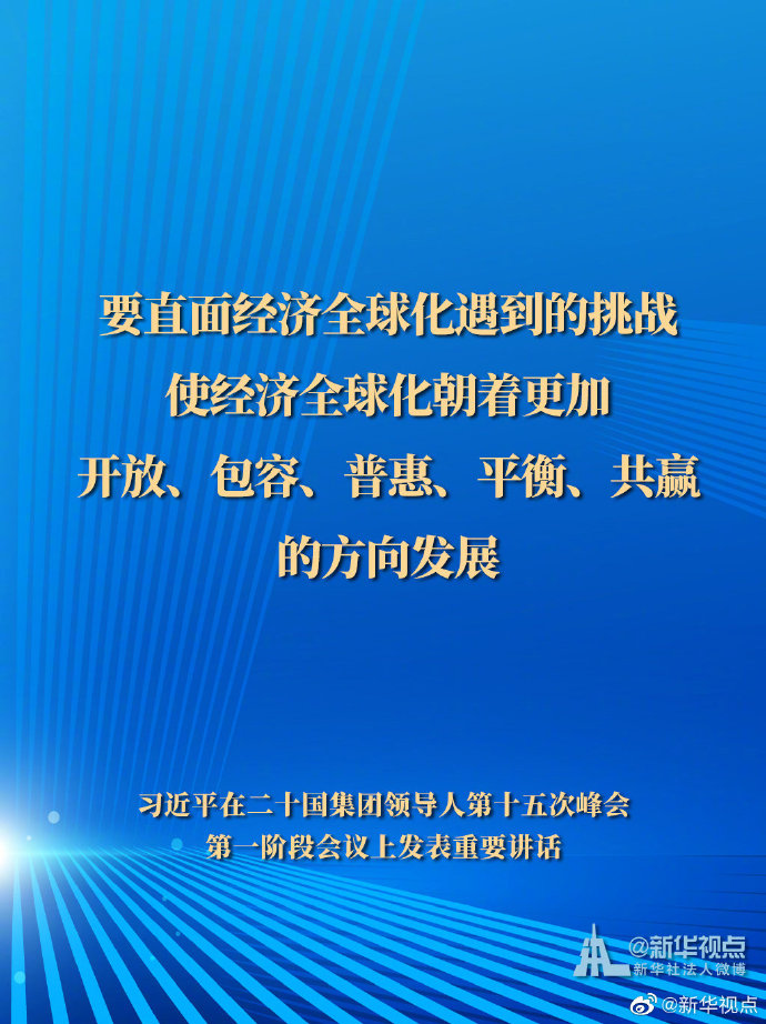 11月21日,國(guó)家主席習(xí)近平在二十國(guó)集團(tuán)領(lǐng)導(dǎo)人第十五次峰會(huì)第一階段會(huì)議上發(fā)表重要講話。一起來(lái)看習(xí)主席的G20金句。