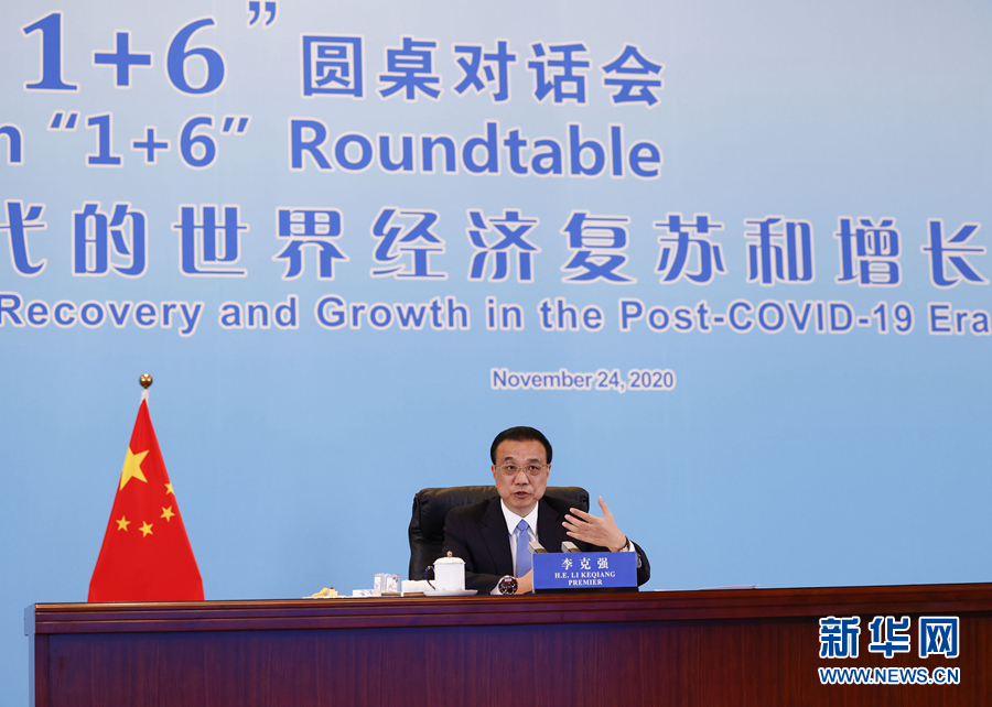 11月24日晚,國(guó)務(wù)院總理李克強(qiáng)在北京釣魚(yú)臺(tái)國(guó)賓館同世界銀行行長(zhǎng)馬爾帕斯、國(guó)際貨幣基金組織總裁格奧爾基耶娃、世界貿(mào)易組織副總干事沃爾夫、國(guó)際勞工組織總干事賴德、經(jīng)濟(jì)合作與發(fā)展組織秘書(shū)長(zhǎng)古里亞和金融穩(wěn)定理事會(huì)主席夸爾斯舉行第五次“1+6”圓桌對(duì)話會(huì)。會(huì)議以視頻方式舉行。新華社記者 黃敬文 攝