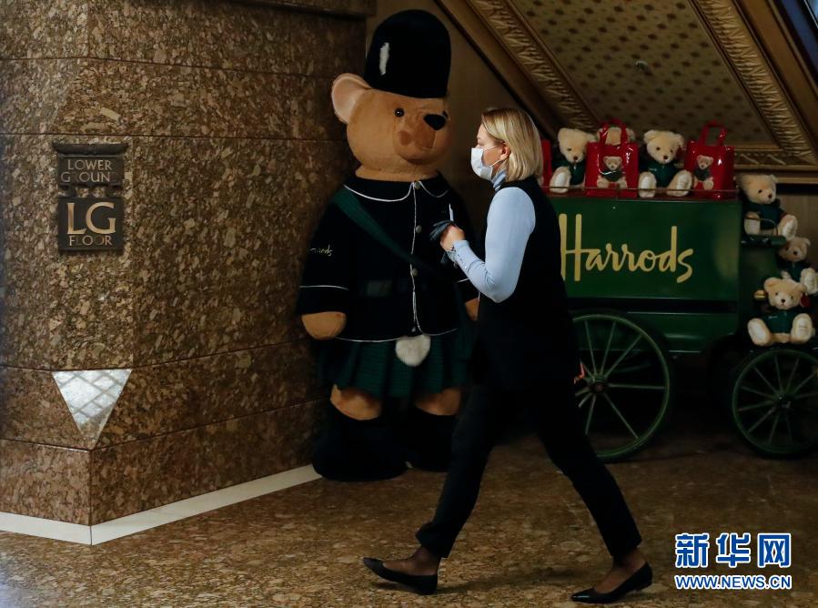 12月2日,一名戴口罩的女子走在英國倫敦重新開門營業(yè)的哈羅德百貨商場內(nèi)。