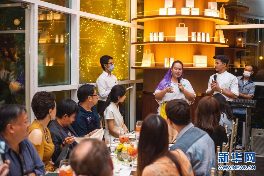 11月23日,廚娘卡妮塔(后排右三)在泰國(guó)曼谷天堂酒店向客人介紹她烹制的葡式、泰式和中式風(fēng)味的融合菜。新華社記者 陳家寶 攝