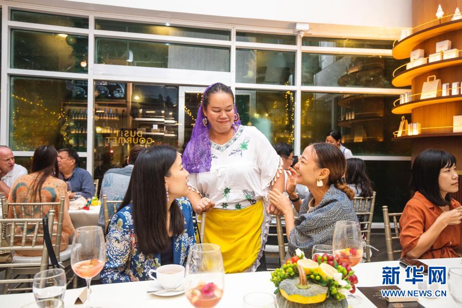 11月23日,廚娘卡妮塔(中)在泰國(guó)曼谷天堂酒店向客人介紹她烹制的葡式、泰式和中式風(fēng)味的融合菜。新華社記者 陳家寶 攝